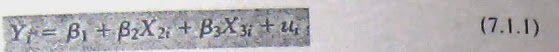 donde Y es la variable dependiente, X2 y X3 las variables explicativas (o regresores), u es el término de perturbación estocástica, e i la iésima observación; en caso de información de series de tiempo, el subíndice t denotará la t ésima observación.